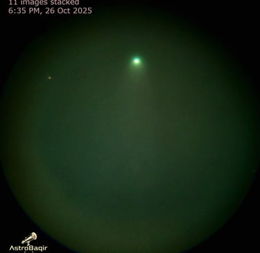 Comet is having beautiful green color and its tail is also visible. It was closes to Earth on 21st Oct 2025 and will be closest to Sun on 8th Nov 2025. From here, Quetta, Pakistan, its current location is exact west and it will be moving horizontally towards South in coming days. I will monitor it as long as it will be bright enough.