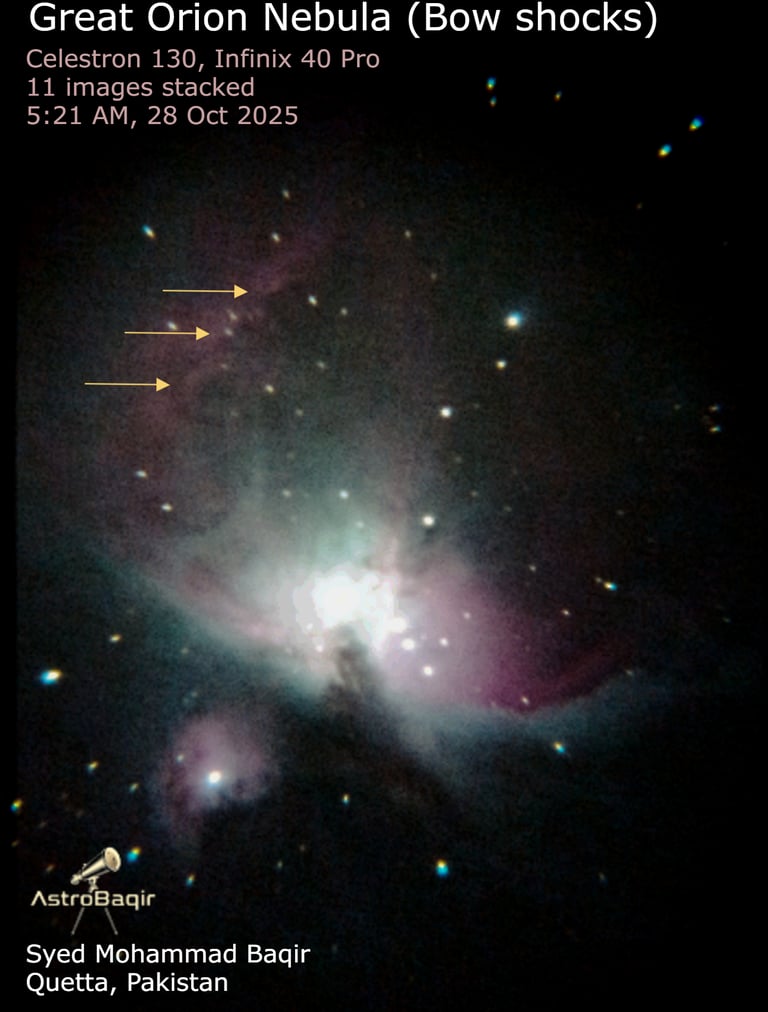 Here in this image we can see the three beautiful bow shocks and amazing image of Orion nebula which is result of images stacking. This is one of most beautiful images to date I have taken of Orion nebula.