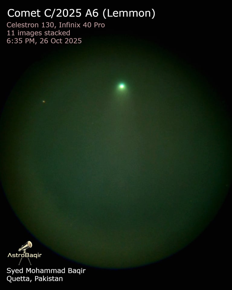 I observed comet Lemmon for the first time on 26th Oct 2025 using my Celestron 130 telescope. I used my Infinix 40 pro cellphone for taking images and Siril software for stacking. Comet was shining on western part of sky, close to horizon. It was bit difficult to hop to comet using less magnification eyepiece because it provided very small amount of time before setting. I had to see it immediately after sunset and before it sets itself. There was much light on sky.